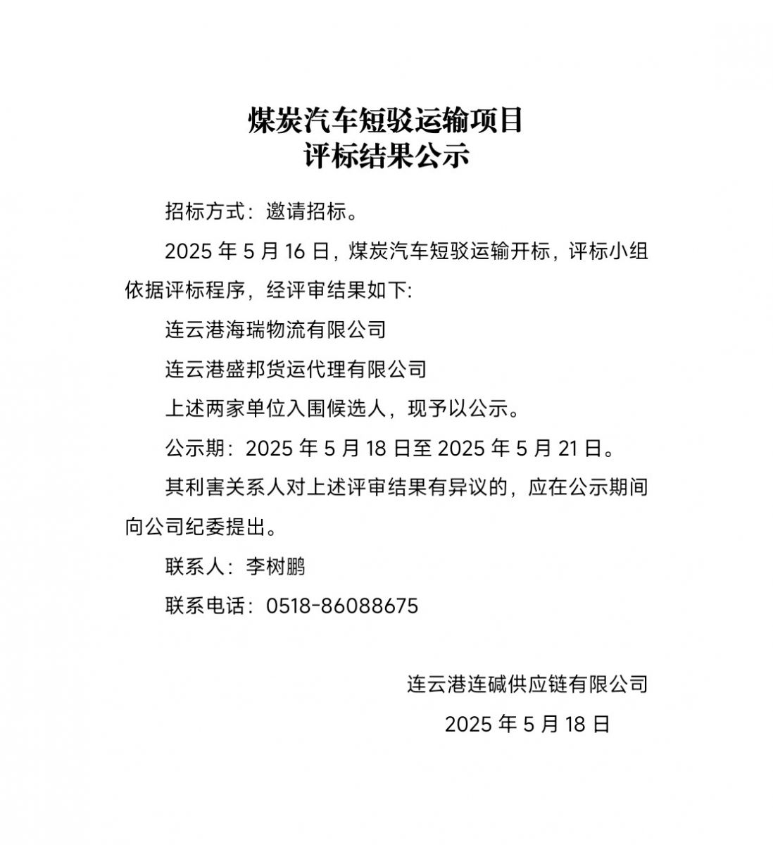 連云港連堿供應鏈有限公司煤炭汽車短駁運輸項目評標結果公示