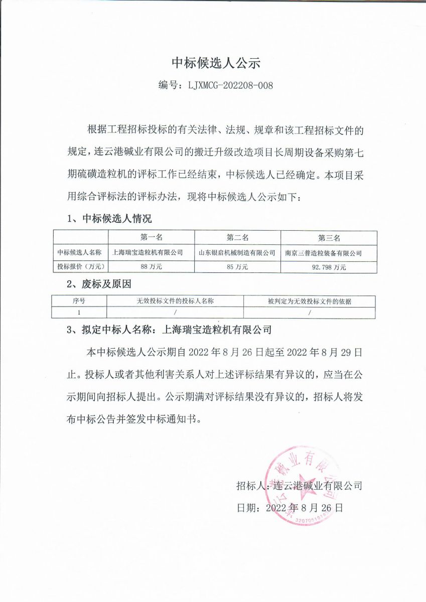 搬遷升級改造項目硫磺造粒機(jī)中標(biāo)候選人公示