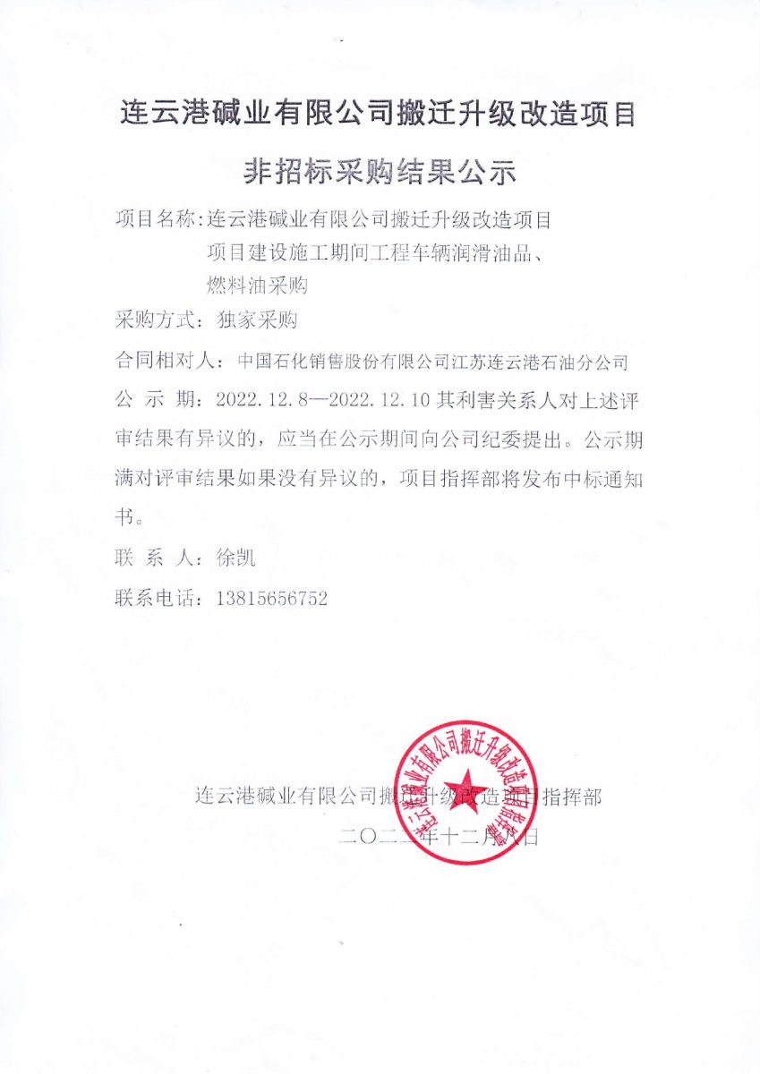 項目建設(shè)施工期間工程車輛潤滑油品、燃料油采購非招標采購結(jié)果公示