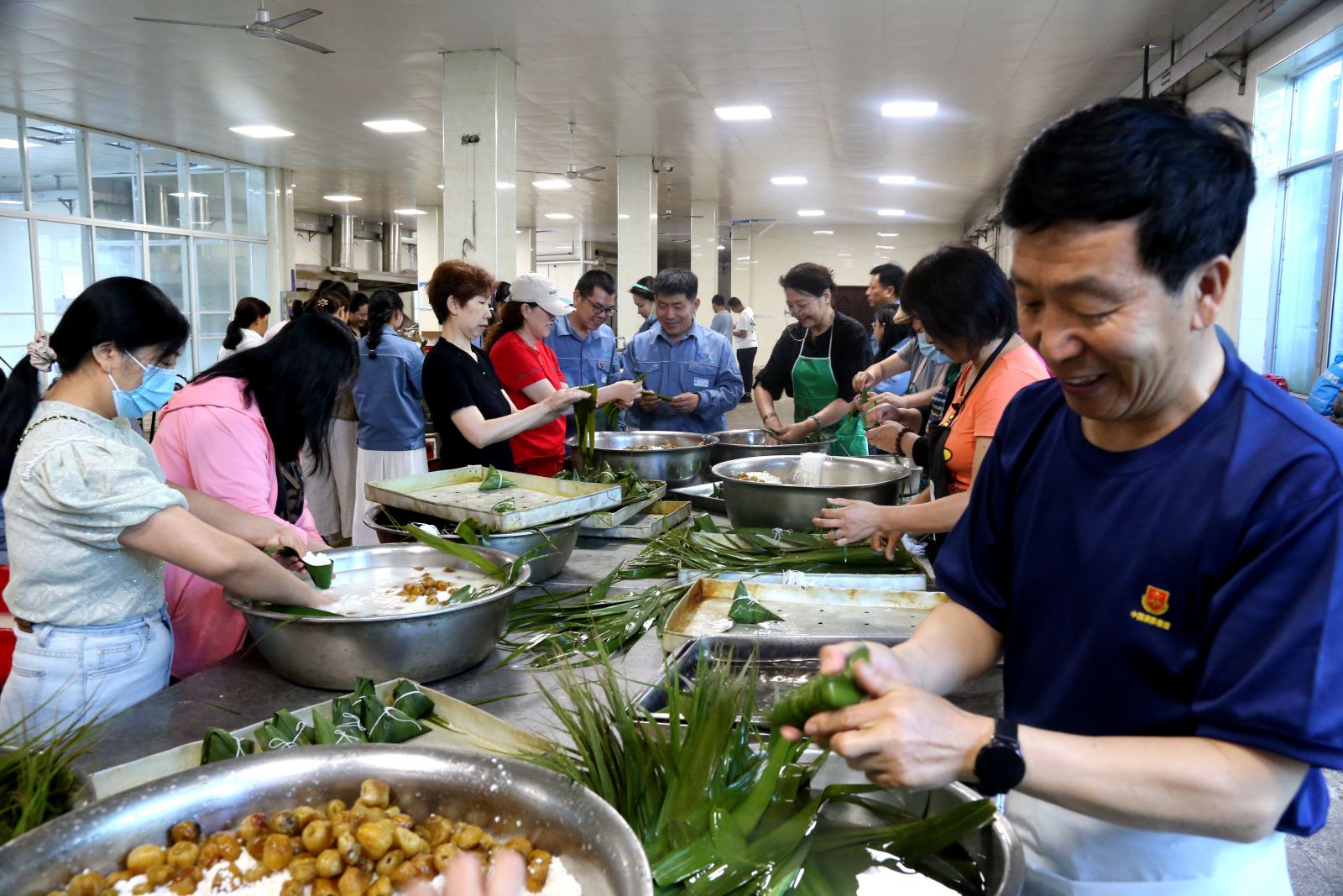 活動現(xiàn)場,食堂工作人員將提前準備好的糯米、粽葉、棉線、剪刀等材料一一擺放,大家圍在一起互相幫助、密切交流,卷葉、放米、裹葉、扎線等動作一氣呵成。經(jīng)過一天的忙碌,在眾人的巧手制作下,1600多個造型各異的粽子誕生了,活動現(xiàn)場洋溢著歡聲笑語。食堂的廚師加班加點將粽子和鴨蛋全部煮熟,涼透保存好,保證了6月7日中午就餐窗口粽子和鴨蛋的特色供應(yīng)。
