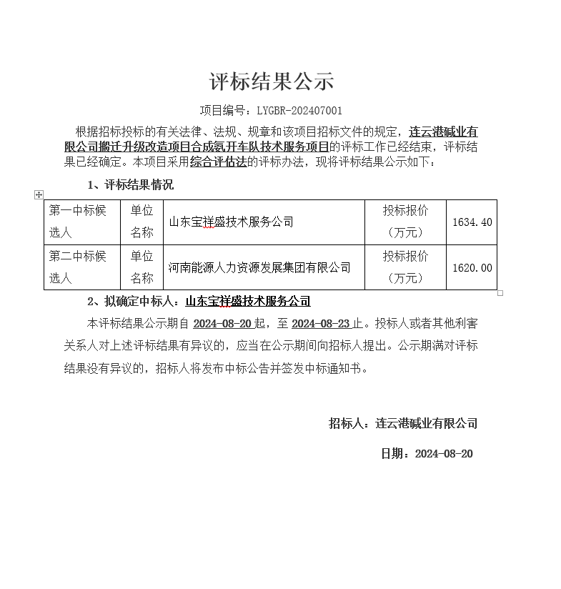 搬遷升級改造項(xiàng)目合成氨開車隊(duì)技術(shù)服務(wù)項(xiàng)目評標(biāo)結(jié)果公示