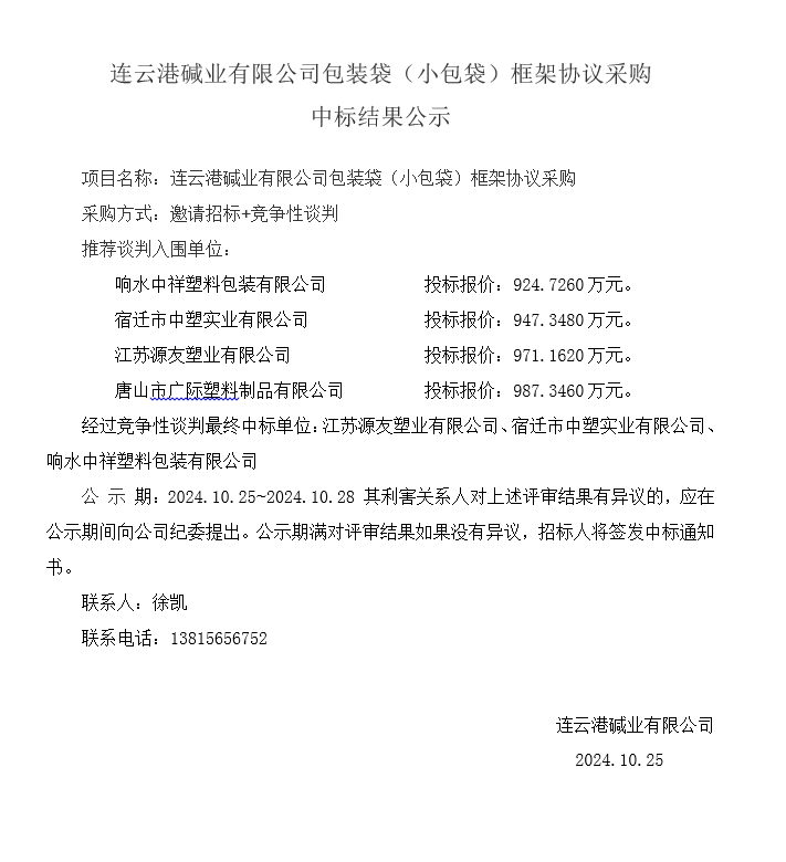 連云港堿業有限公司包裝袋(小包袋)框架協議采購中標結果公示